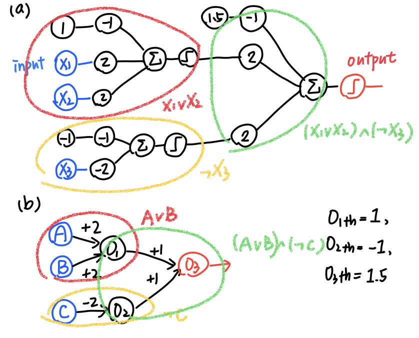 图(六):output = (A + B) C̄,(a) 人工神经元 (b) 生物神经元,其中神经元 O_i, i = 1,2,3 的阈值分别为 1, -1, 1.5