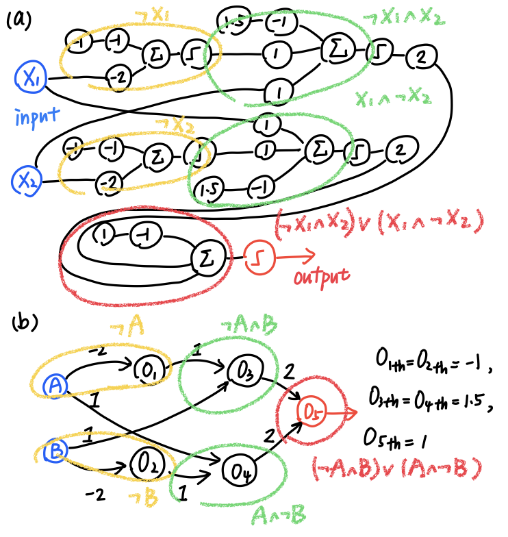 图(七):异或门,(a) 人工神经元 (b) 生物神经元